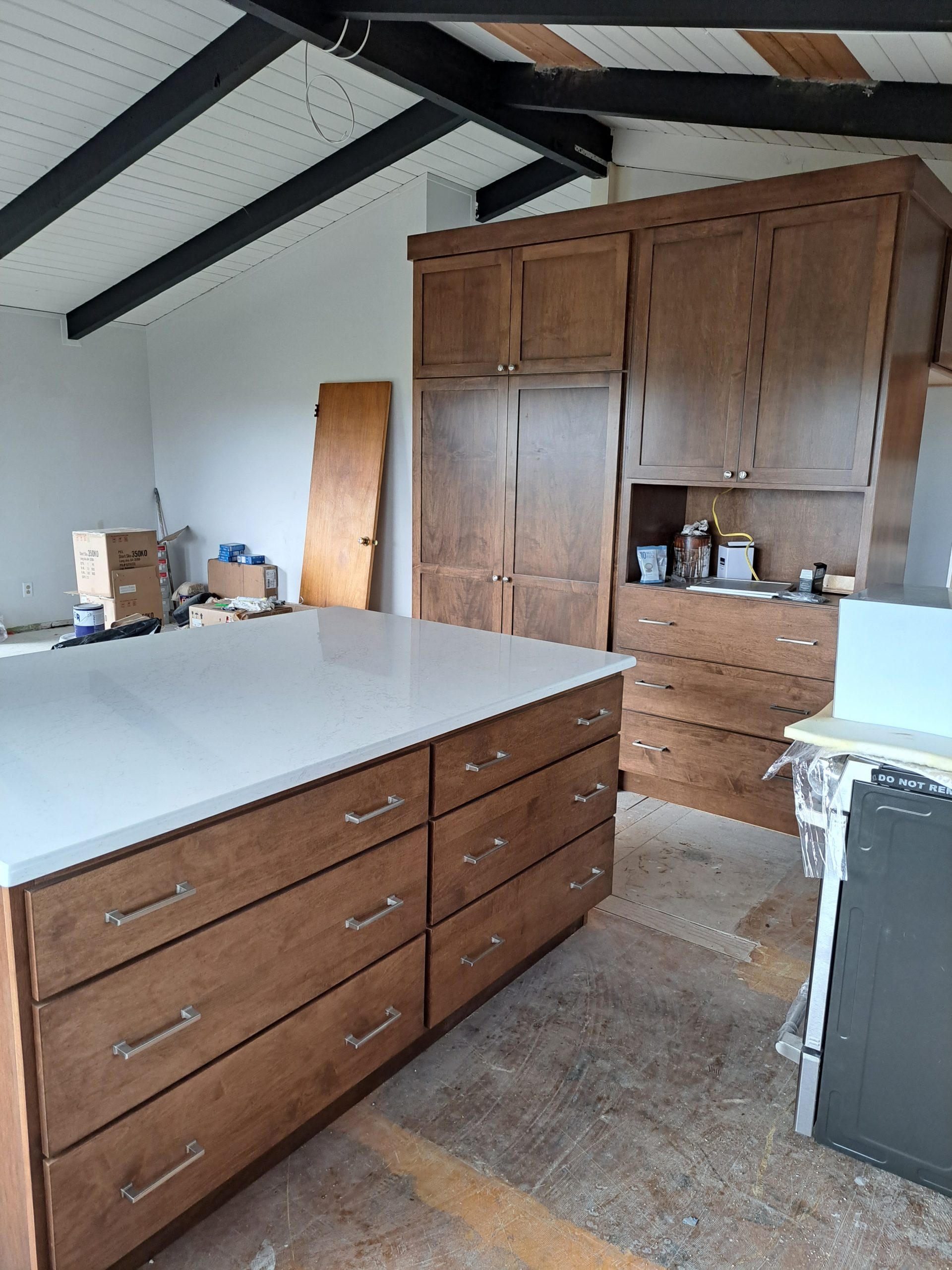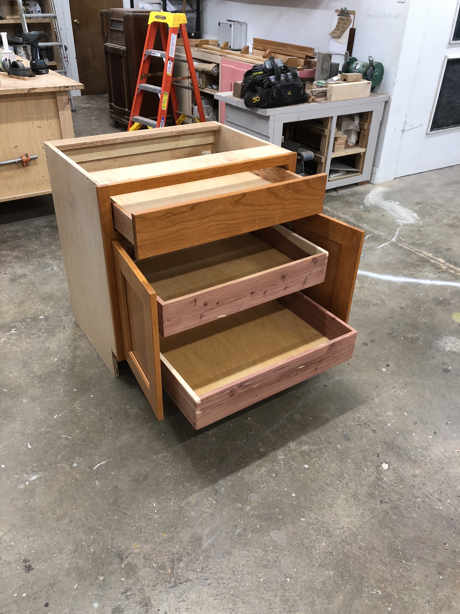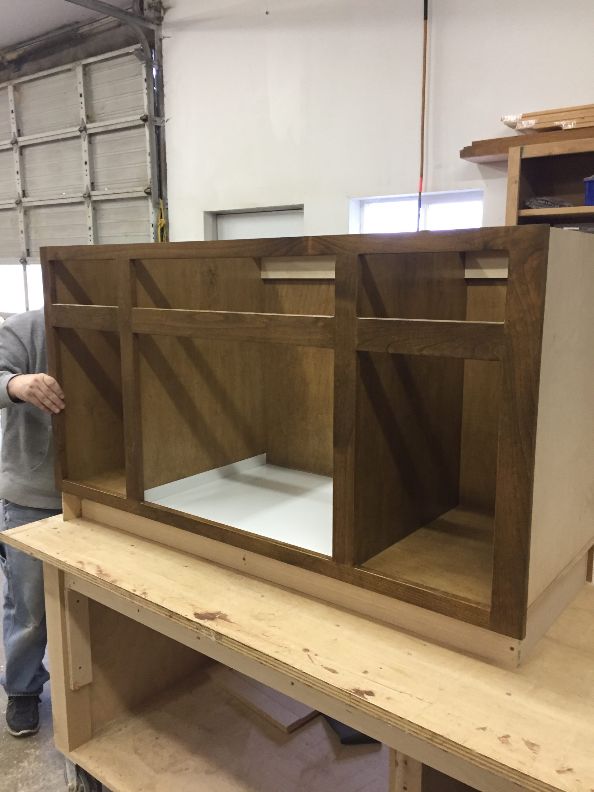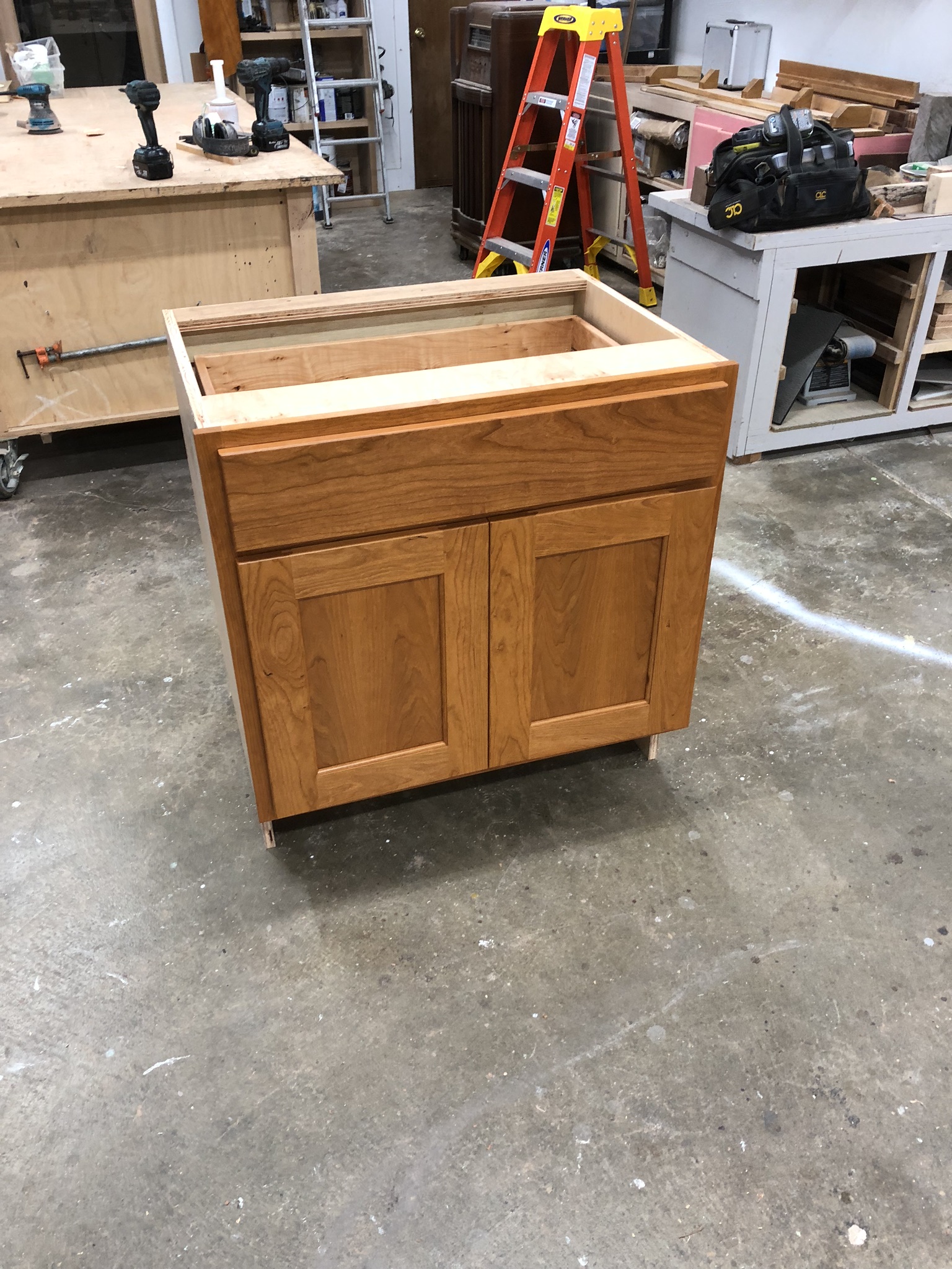 This project was a custom cabinet build for my first customers who wanted me to build them a kitchen from scratch at my first real shop. It has held up nicely. I have been back several times over the years to check on it when I remodeled their bathrooms, mantle, built a walnut cabinet, and various other projects (some of which are pictured).